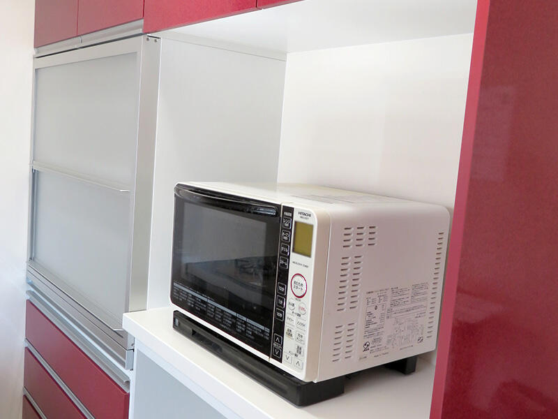 ビビットな赤の扉カラーに合わせて、コンロの天板もピンクをお選びいただきました。