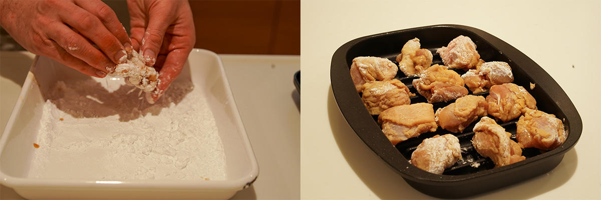 - 2. 片栗粉をまんべんなくまぶし、5分ほど置いてなじませます。